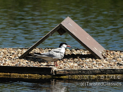 From the bird hide that is nearest to the entrance to the park I saw this adult tern standing in front of a shelter on a small raft that was covered with pebbles.